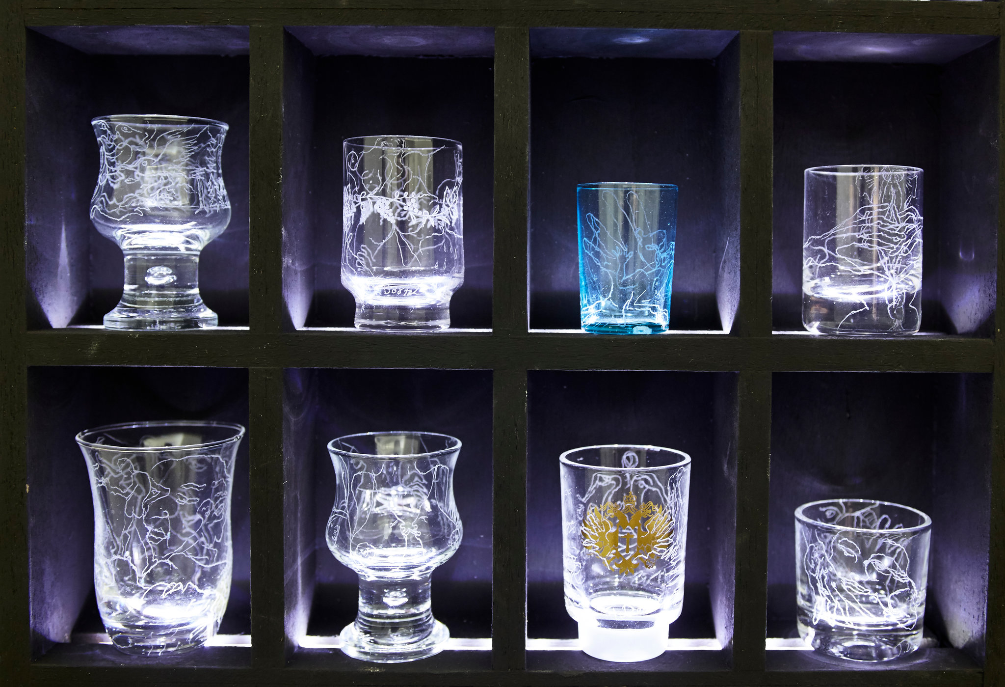 etched shot glasses, lit wall dependent curio cabinet